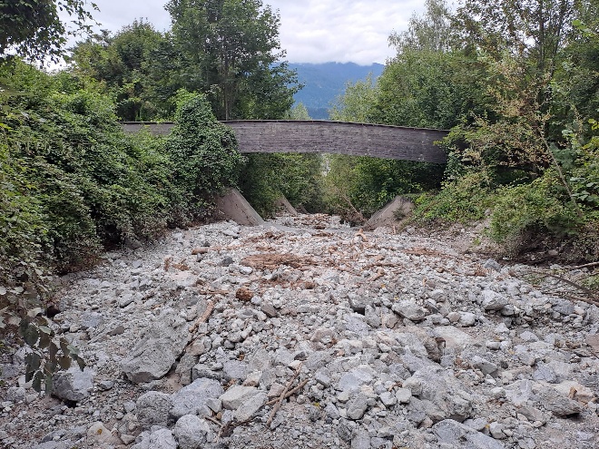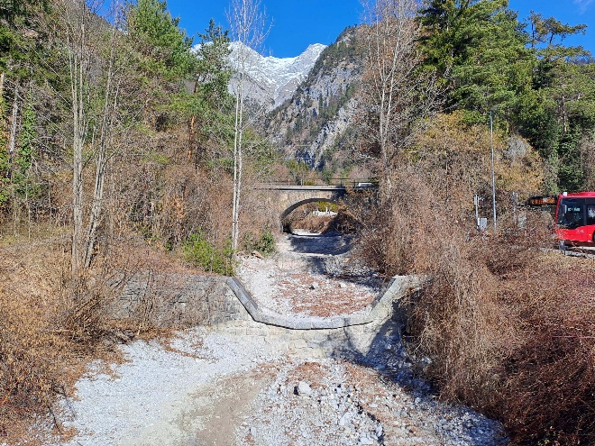 Aus Sorge, dass bei weiteren Unwettern kein ausreichender Schutz mehr gegeben war und möglicherweise Verklausungen drohten, wandte sich die ILK bereits damals an die zuständige Wildbach- und Lawinenverbauung. Es hat eine Zeit gedauert, aber in der letzten Woche wurde das Bachbett nun ausgebaggert, auch noch ein gutes Stück oberhalb der Bahn. Die umfangreichen Arbeiten dauerten eine Woche, bei der Buskehre wurde eine Zufahrtsrampe ins Bachbett errichtet, und es war beeindruckend, wie viele LKW-Fuhren abtransportiert wurden.
